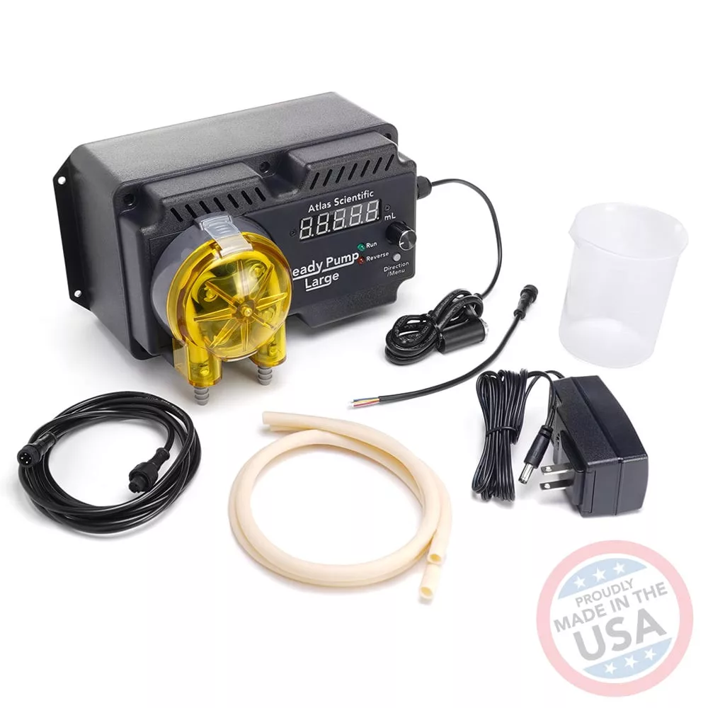 A Ready Pump nagy változata: 10-750 ml/perc áteresztéssel, előre összeszerelve, azonnal használatra kész. Kézi vagy automatikus vezérlés, ipari megjelenés. Nagyobb hidroponikus rendszerekhez, vízkémiai kezeléshez, ipari adagoláshoz.
